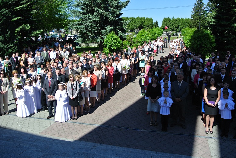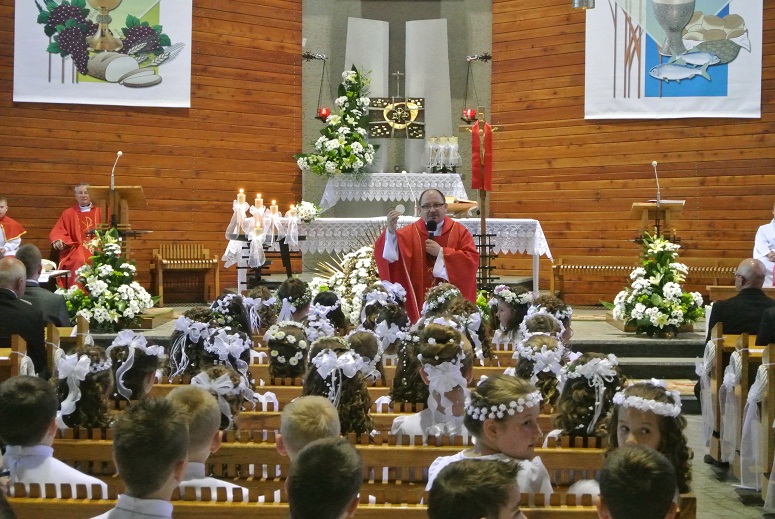 - Uroczystość Pierwszej Komunii Świętej W niedziele Zesłania Ducha Świętego, 20 maja w naszej parafii odbyła się piękna Uroczystość Pierwszej Komunii świętej. 58 dzieci, które dzień wcześniej przyjęły sakrament Spowiedzi, po raz pierwszy przyjęło do swojego serca Pana Jezusa. Podczas Mszy św. ks. Stanisław Joneczko zwrócił uwagę dzieciom, że w sakramencie Eucharystii Pan Jezus daje nam się za darmo. Podczas popołudniowego nabożeństwa dzieci odnowiły przyrzeczenia chrzcielne i otrzymały pamiątkowy obrazek.