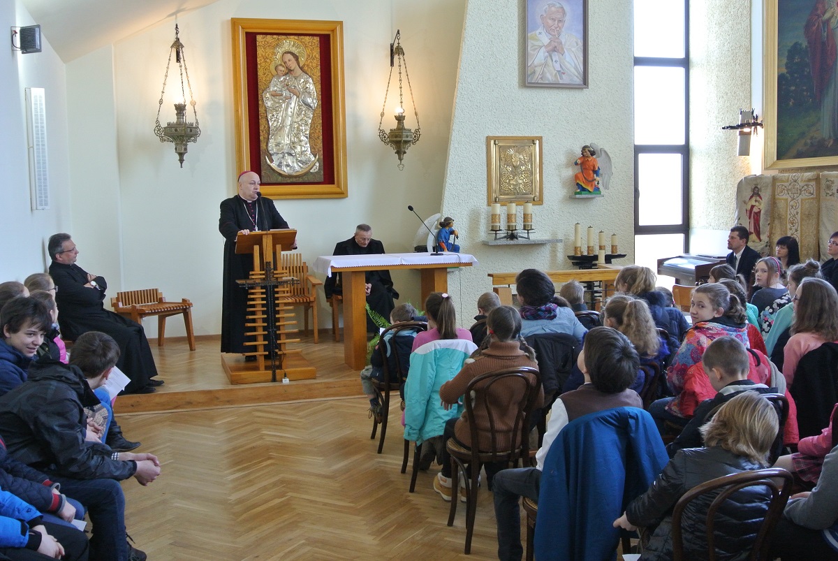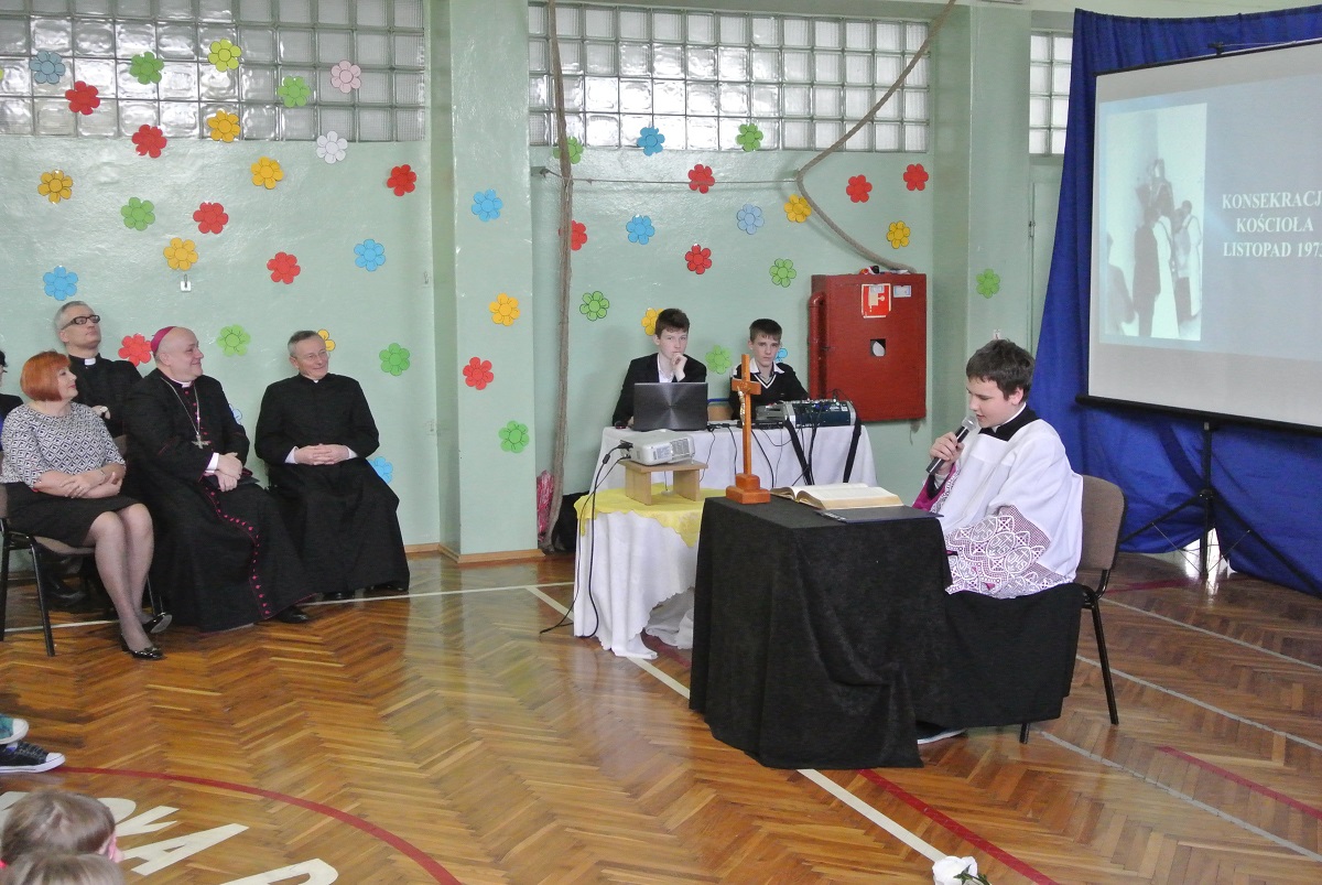 W środę 25 lutego, ksiądz biskup nawiedzi naszą parafie jeszcze raz. Przybył on do naszych szkół. Na Sali Gimnastycznej spotkał się z dziećmi ze Szkoły Podstawowej, które wraz z uczniami Gimnazjum przygotowali występ o patronie szkół – św. Janie Pawle II. Następnie przeszedł do Gimnazjum, gdzie na hali sportowej odpowiadał na pytania uczniów naszego Gimnazjum. Na zakończenie biskup Piotr już przy stole rozmawiał z nauczycielami.